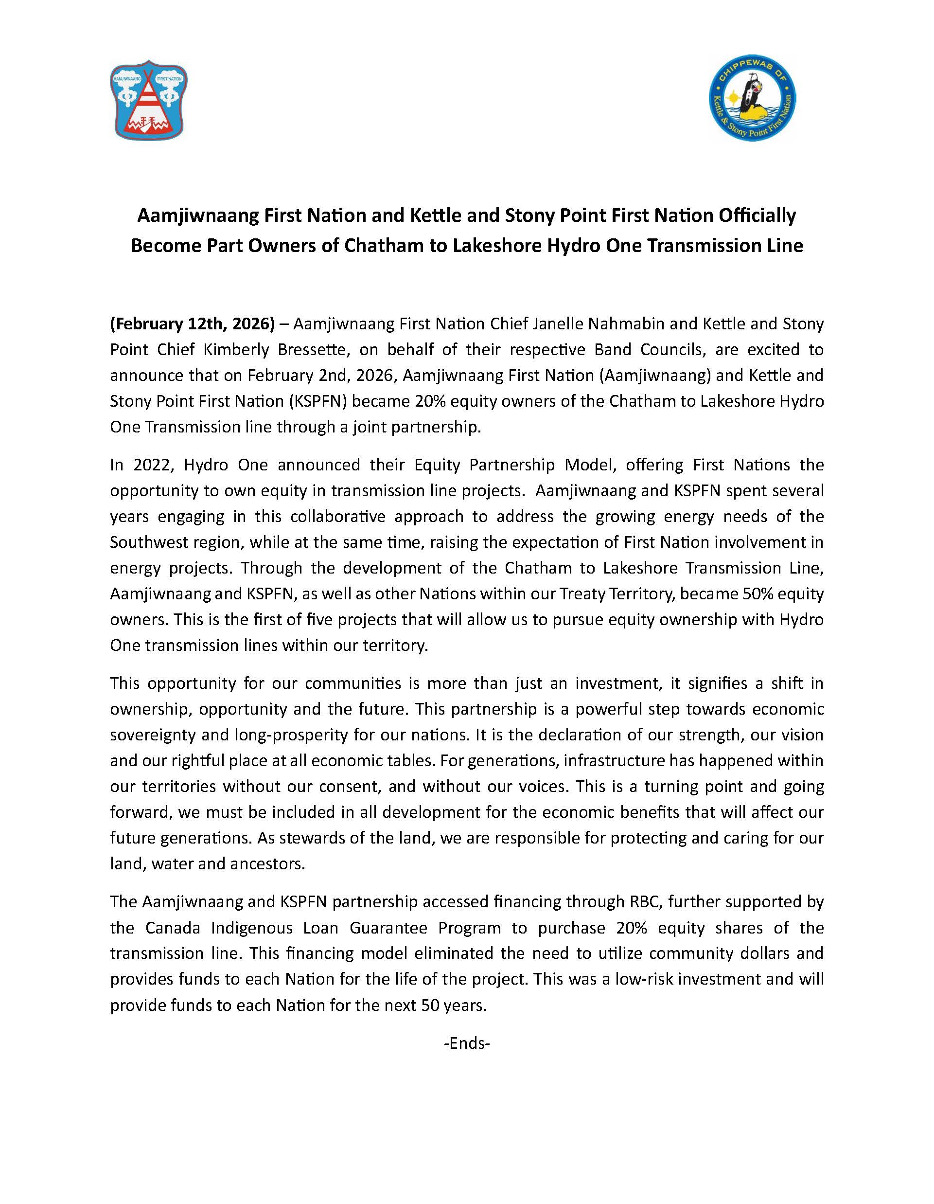 Aamjiwnaang First Nation and Kettle and Stony Point First Nation Hydro One Joint Partnership
